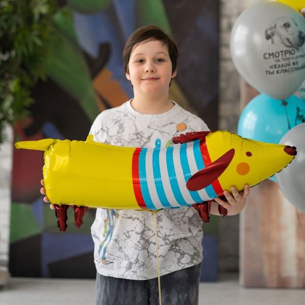Фольгированный шар-фигура такса в полосатом свитере для украшения детских праздников, составления воздушных композиций, дополнения фотозон, кенди-баров, проведения веселых праздников с конкурсами. Шарик надувается через обратный встроенный клапан, который не дает ему сдуваться более двух недель. Размер: 33''/83см. Тематика: фольгированне шары, животные, день рождения