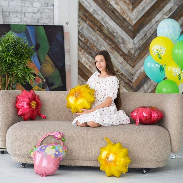 Шарик-фигура желтый цветок для украшения сцены на конкурсе красоты, оформления интерьера на дне рождения, девичнике, свадьбе, составления воздушного букета. Фигурный фольгированный шар изготовлен из прочной майларовой пленки, хорошо держит форму и не сдувается более двух недель. Размер: 21"/53см. Тематика: фольгированне шары, 8 марта, день рождения