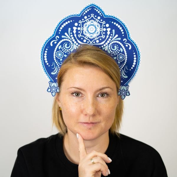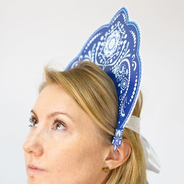 Картонный кокошник, раскрашенный в стиле Гжель для праздника или выступления. Оригинальный кокошник с росписью дополнит народный костюм и поможет создать стильный образ. Изготовлен из плотного картона. Надежно фиксируется на голове и не спадает во время танца или игр. Размер: 269 мм.