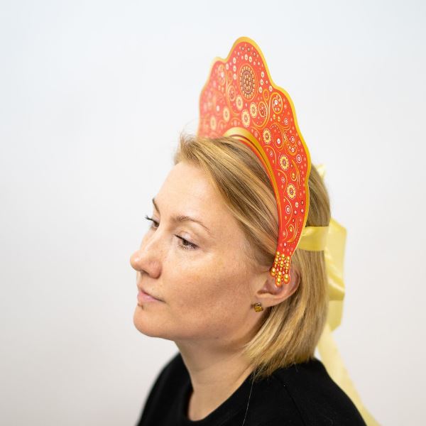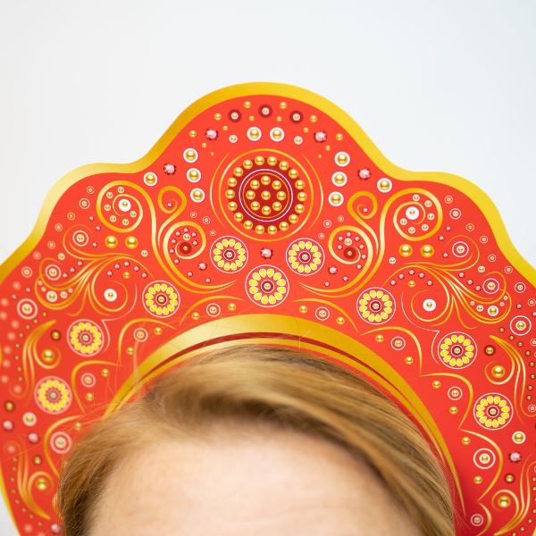 Кокошник из картона красного цвета с оригинальным рисунком в русском стиле станет ярким акцентом карнавального костюма или тематического наряда. Легко фиксируется на голове, не спадает во время танца или выступления. Изготовлен из прочного и экологичного материала. Размер: 247 мм.