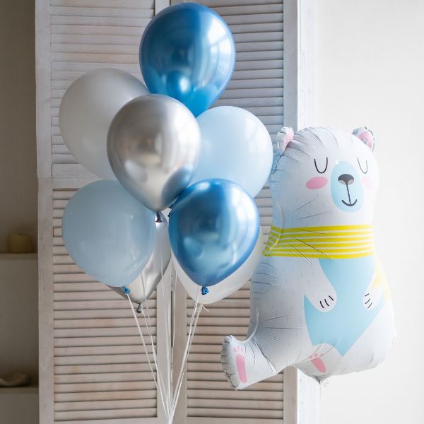 В набор входят латексные шары: Хром BLUE 12"/30 см - 4 шт, Пастель Macaroon BLUEBERRY 12"/30 см - 3 шт, Пастель WHITE 12"/30 см - 4 шт, Хром SILVER 12"/30 см - 4 шт. Производитель: Ячен Индастриал Груп Ко, ЛТД (Китай).