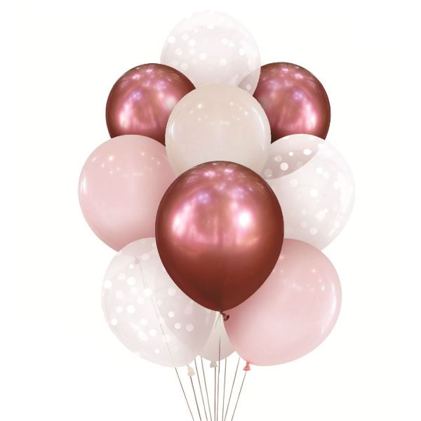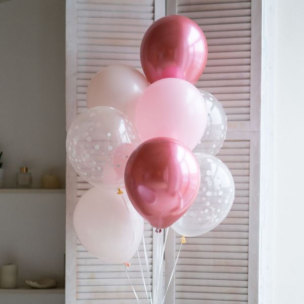 В набор входят латексные шары: Хром ROSE RED 12"/30 см - 4 шт, Пастель PINK 12"/30 см - 4 шт, Пастель Macaroon STRAWBERRY 12"/30 см - 3 шт, Декоратор TRANSPARENT с рис. Конфетти белые - 4 шт. Производители: Ячен Индастриал Груп Ко, ЛТД (Китай), Латекс Оксидентл (Мексика).