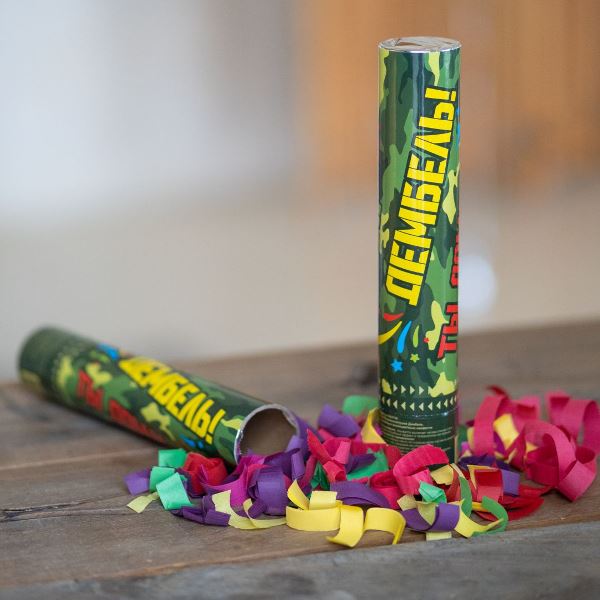 Тематическая хлопушка для празднования завершения службы с надписью на корпусе «Дембель». При сработке механизма вылетает серпантин красного, розового, фиолетового, желтого, синего, зеленого цветов. Срабатывает при повороте по стрелкам, показанным на тубе. Не пиротехника. Безопасна для использования в помещениях. Размер: 30 см.