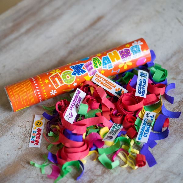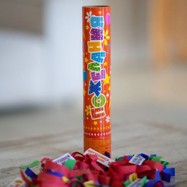 Пневматическая хлопушка с бумажным конфетти красного, синего, розового, желтого и зеленого цветов и надписями с пожеланиями. Сработка происходит за счет энергии сжатого воздуха. Не является пиротехническим средством. Для активации необходимо повернуть по стрелкам, как указано на тубе. Размер: 30 см. Хлопушка на новый год, хлопушка на день рождения
