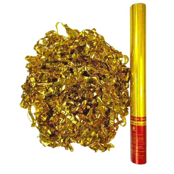 Пневматическая хлопушка для взрослых и детских торжественных мероприятий. При сработке вылетает серпантин золотого цвета. Не является пиротехническим средством. Можно использовать в помещении без ограничений. Для приведения в действие хлопушки необходимо повернуть по указанным на корпусе стрелкам. Размер: 40 см. Хлопушка на новый год, хлопушка на свадьбу, вечеринка