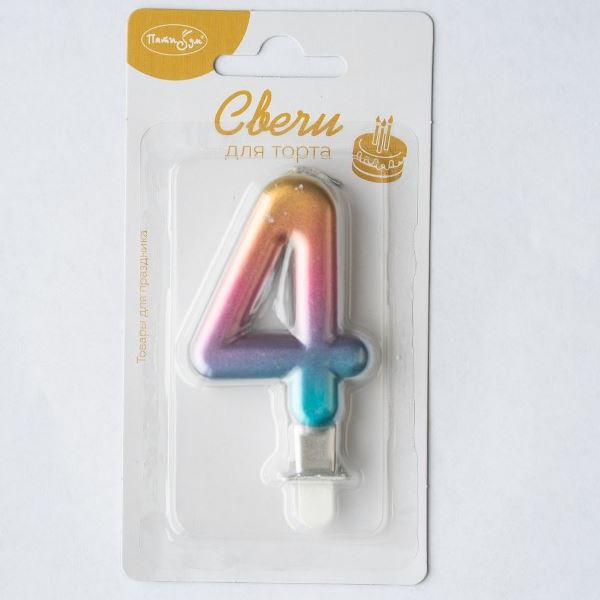 Радужная цифра-свечка в форме четверки из парафина пищевого назначения. Экологичный и простой в применении декор из коллекции «Радужная» оснащен специальным держателем плоского типа в нижней части, который обеспечивает простоту установки и снятия. Свеча не оставляет на пищевых продуктах следов при горении, не выделяет вредных веществ. Размер: 7 см. Вес: 22 гр. Свечи на торт, свеча цифра