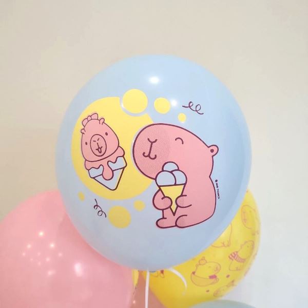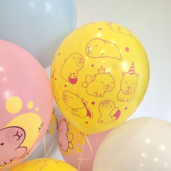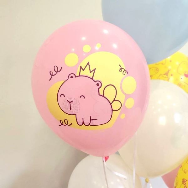 Латексные шарики розового, голубого и желтого цветов с изображением милых малышей-капибар. Оригинальные шары могут быть собраны в воздушную композицию, ими можно украсить интерьер, кенди-бар, оформить фотозону. Изготовлены из эластичного латекса. Надуваются helium или воздухом. Размер: 12"/30см. В упаковке 5 штук. Производитель: Latex Occidental. Бренд: Globos Payaso (Глобос Паясо). Шары десткие, шары на день рождения, шарики на день рождения