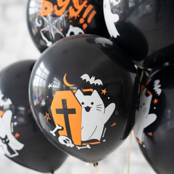 Тематический набор воздушных шаров черного цвета с оригинальными принтами. Подойдет для украшения интерьера, арки, сцены на празднике Хэллоуин. Шарики с забавными котами-приведениями в оранжево-черной цветовой гамме украсят взрослы или детски праздник. В упаковке 25 штук. Размер: 12"/30 см. Latex Occidental. Бренд: Globos Payaso (Глобос Паясо). Шары на день рождения, шары на хэллоуин, шары с котиками